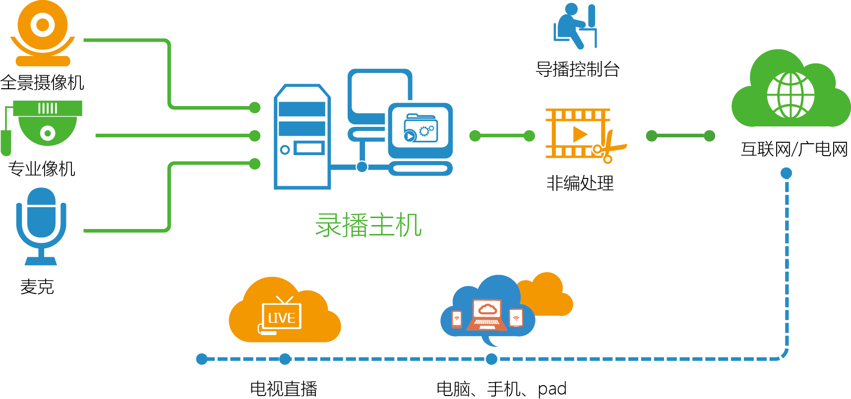 校园电视台以宣传校园新闻、校园文化、学生生活为主体,通过高清音视频信号采集,并对其信号进行专业导播、智能抠像、后期剪辑、字幕添加,实现校园文化和教学活动的实时传播,丰富校园生活。