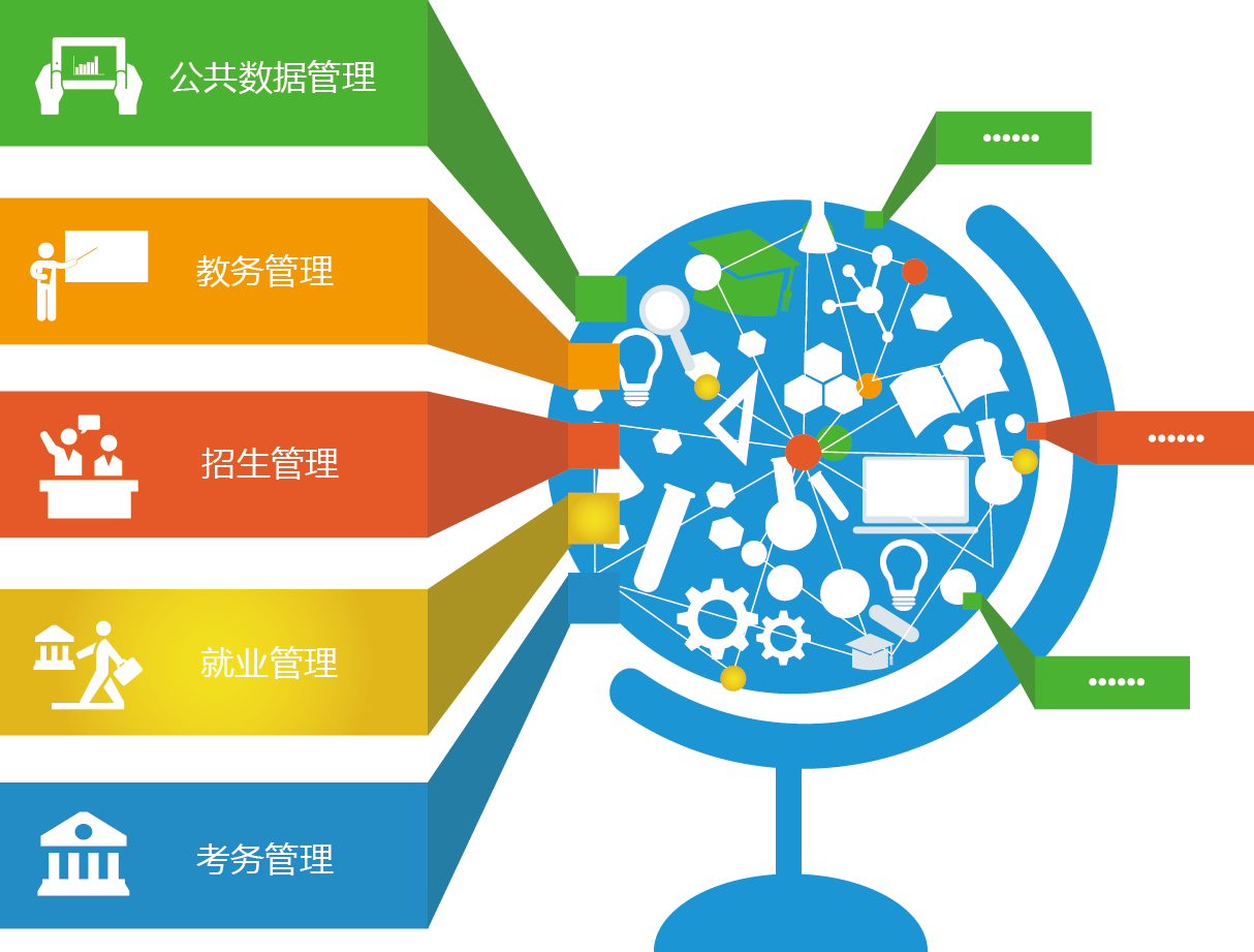 职业教育数字化校园管理平台由公共数据管理、教务管理、招生管理、就业管理、考务管理等功能模块组成,实现校园的信息化、智能化管理,助力智慧校园建设。