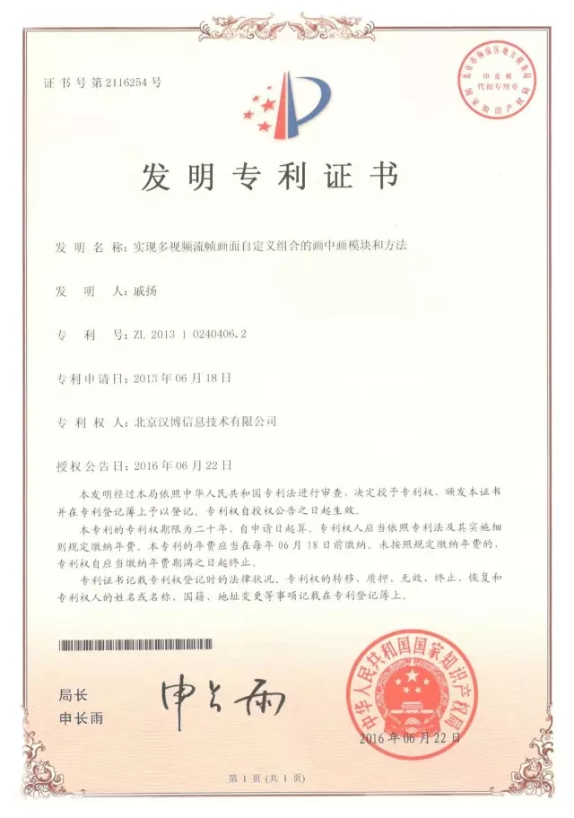 北京汉博信息技术有限公司(以下简称“汉博公司”)近期获得了一项由中华人民共和国国家知识产权局颁发的发明专利证书,信息如下: 发明名称:实现多视频流帧画面自定义组合的画中画模块和方法 专利号:ZL 2013 1 0240406.2 专利申请日:2013年06月18日 专利权人:北京汉博信息技术有限公司 授权公告日:2016年06月22日 专利权期限:20年 实现多视频流帧画面自定义组合的画中画模块和方法此项发明专利证书的获得,进一步体现了公司的自主研发及创新能力,对公司开拓市场及推广产生积极的影响,形成持续创新机制,保持技术领先性,提升公司核心竞争力。 凭借着技术创新和管理创新的发展理念,公司始终坚持走自主创新的发展道路,持续研发投入,拥有一支在可视化数据技术应用领域经验丰富的研发团队。 公司以视联网技术为核心,独立研发可视化数据的全息采集、高效传输、分布存储以及大数据分析和行业应用,专注于智慧教育、智能医疗行业领域,为客户提供先进的可视化数据行业云平台“+互联网”。